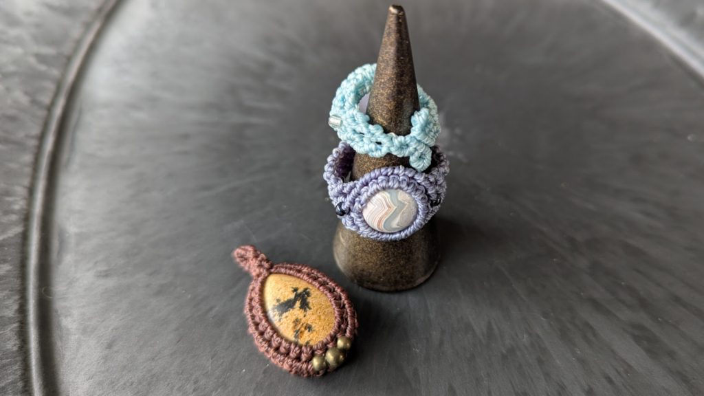 ペンダントの首紐とその先端の装飾を、巻き結びとライン結びで作ります。